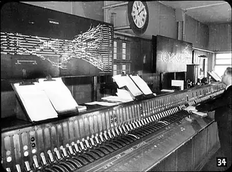And now I want to take you into the very heart of the railway system. You have probably realised that all these trains and stations and workshops and the power which drives them would be useless without the guiding hand of man, the brain behind it all. |