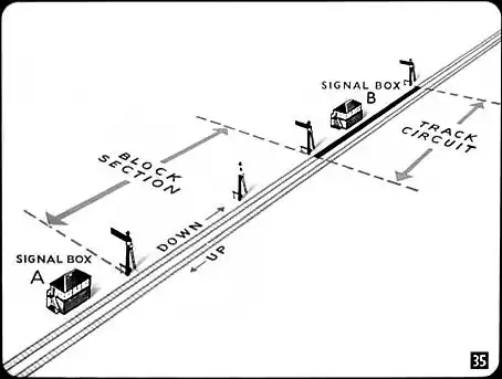 Britain has the safest railways in the world largely because of good signalling equipment, complete fencing of the track, raised platforms at all stations and close and detailed examinations of rolling stock and locomotives. And what we call block working is the very basis of our signalling system. No train can be signalled into the block section while there’s another train in it. In many areas, too, one of the running rails carries a small electric current, and as soon as it is occupied by the passage of a train the signals are automatically locked against any other trains trying to enter that portion of the track. This system is known as ‘track circuiting’.