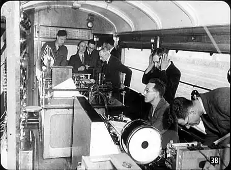 Here’s another way in which testing is carried out – in what is known as a dynamometer car coupled to the locomotive itself. This is the inside of such a car; this one belongs to the London Midland Region. Behind this coach is an ordinary train, and the men you see here are measuring, with the help of recording instruments, the amount of pull, in pounds, on the drawbar which con-nects the locomotive with the rest of the train. They take other measurements too, and can find out a great deal about the locomotive’s performance under all sorts of conditions of running.