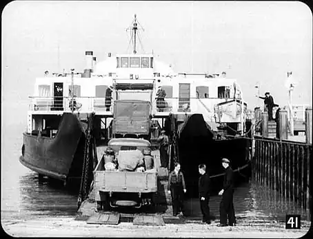 Here’s the motor vessel Farringford, which was brought into service in March 1948. She does the short trip between Lymington in Hampshire and Yarmouth, Isle of Wight. She’s a diesel-electric passenger and motor-car ferry and, as you can see, motor vehicles can be driven straight aboard her. What is more, she’s double-ended, so that the vehicles can be driven ashore from the other end, when the crossing is over, without having to turn round. The Farringford can go at the same speed ahead or astern. she has duplicate controls in the twin wheel-houses, and two rudders at each end. In fact, you can go or come back without noticing the difference really. She carries 320 passengers and 32 cars, or 800 passengers without cars. |