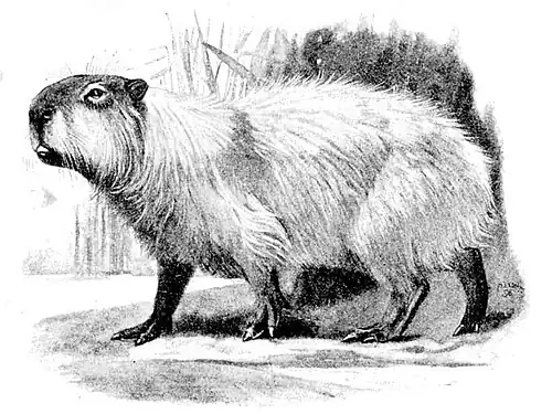 Fam. 3. Caviidae.—This family, which includes the Cavies and the Capybara, is entirely South American and West Indian in distribution. It embraces animals of fair to large size, the Capybara (or Carpincho) being the greatest of existing Rodents. The ears are well developed. The toes are commonly reduced, and the members of this family possess only a rudimentary tail. The hair though rough is not spiny. Other characters had best be deferred until the several genera are treated of. We shall begin with the giant of the family, the genus Hydrochoerus. This genus contains but a single species, H. capybara of South America. It reaches a length of some 4 or 5 feet. The ears are not large; the tail is completely absent. The fore-feet are four-toed, the hind-feet three-toed; the digits are webbed, though not to a very great degree, and the nails have the appearance of hoofs. There are fourteen dorsal vertebrae; the clavicle is absent. In the skull the paroccipital processes are of great length. The infra-orbital foramen is large. The most remarkable fact about the teeth is the great size of the posterior molar of the upper jaw; it has fourteen folds of enamel, more than all the anterior teeth possess collectively. The incisors are white and grooved in front. The measurements of the alimentary tract as given by Tullberg are: small intestine, 4350 mm.; caecum, 450 mm.; large intestine, 1500 mm.