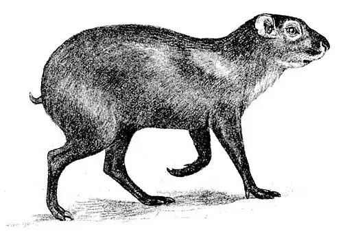 The genus Dasyprocta, containing those Rodents known as Agoutis, is divisible into several species, apparently about twelve, all of which are, like the Pacas, confined to the Neotropical region. They have, however, a much wider range within that region, and occur as far north as in Central America and in some of the West Indian Islands. They are of rather smaller size than the Paca, and are without spots. The colour is of a golden brown in some forms, but usually has a freckled, grizzled, greenish kind of appearance. The tail is stumpy, the hind-limbs are distinctly longer than those of the Paca, and the two lateral toes have disappeared from the feet—a concomitant as it seems of the Agouti's greater powers of running. The three metatarsals are closely pressed together, and the foot is as it were on the way towards the highly-modified foot of the Jerboa. The fore-feet are, however, five-toed. The clavicle is rudimentary,[40] whereas it is well developed in the Paca. The skull has not the peculiar modifications of that of the last-mentioned type. The sternum has seven pieces, and eight ribs reach it. A curious difference between this genus and the last is in the relative proportions of the regions of the intestine. The figures given by Tullberg for the two animals are—for Coelogenys, small intestine, 4800 mm.; caecum, 230 mm.; large intestine, 21,000 mm.;—for Dasyprocta aguti the same author gives: small intestine, 4200 mm.; caecum, 200 mm.; large intestine, 1000 mm. The Agouti, says Mr. Rodway,[41] is as wily as the Fox. "If chased he will run along the shallows of a creek to hide his scent from the dogs, or swim over and back again several times for the same purpose. He never runs straight when pursued, but doubles, often hiding until a dog has passed, and then making off in a different direction. Like the fox he has been hunted for a very long period, and, like Reynard, has grown wiser with every generation."