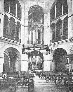 Ecclesiastically, Aachen constitutes a deanery of the archdiocese of Cologne. It has a collegiate chapter, already mentioned, with a provost, six regular and four honorary, canons; 12 Catholic parishes, 46 Catholic churches and chapels; in 1906, there were 87 secular, and 24 regular, clergy, besides 9 priests from other dioceses. The minster ranks first among the church buildings; it consists of three distinct parts: the octagon, the choir, and the crown, or ring, of chapels, the octagon forming the central portion. This last is the most important monument of Carlovingian architecture; it was built between 796 and 804, in the reign of Charlemagne, by Master Odo of Metz, and modeled after the Italian circular church of San Vitale at Ravenna. It was consecrated by Pope Leo III. It is an eight-angled, domed building, 54 feet in diameter, with a sixteen-sided circumference of 120 feet, and a height of 124 feet. The interior of the dome is adorned with mosaics on a gold ground, executed by Salviati of Venice, in 1882, representing Our Lord surrounded by the four and twenty Ancients of the Apocalypse. The main building was decorated with marble and mosaics in 1902 after the designs of H. Schaper. Over the spot supposed to be the site of Charlemagne's grave hangs an enormous corona of lamps, the gift of the Emperor Frederick I, Barbarossa; in the choir of the octagon, the so-called upper minster, stands Charlemagne's throne, made of great slabs of white marble, where, after the coronation, the German emperors received the homage of their nobles. The rich upper choir, built in Gothic style, joins on to the eastern side of the octagon; it was begun in the second half of the fourteenth century, and dedicated in 1414. The thirteen windows, each 100 feet high, have been filled with new colored glass; on the pillars