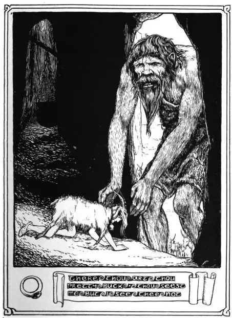 "I was then," said Conall, "quite a young lad, and I went out hunting, and my father's land was beside the sea, and it was rough with rocks, caves, and rifts. When I was going on the top of the shore, I saw as if there were a smoke coming up between two rocks, and I began to look what might be the meaning of the smoke coming up there. When I was looking, what should I do but fall; and the place was so full of heather, that neither bone nor skin was broken. I knew not how I should get out of this. I was not looking before me, but I kept looking overhead the way I came—and thinking that the day would never come that I could get up there. It was terrible for me to be there till I should die. I heard a great clattering coming, and what was there but a great giant and two dozen of goats with him, and a buck at their head. And when the giant had tied the goats, he came up and he said to me, 'Hao O! Conall, it's long since my knife has been rusting in my pouch waiting for thy tender flesh.' 'Och!' said I, 'it's not much you will be bettered by me, though you should tear me asunder; I will make but one meal for you. But I see that you are one-eyed. I am a good leech, and I will give you the sight of the other eye.' The giant went and he drew the great caldron on the site of the fire. I myself was telling him how he should heat the water, so that I should give its sight to the other eye. I got heather and I made a rubber of it, and I set him upright in the caldron. I began at the eye that was well, pretending to him that I would give its sight to the other one, till I left them as bad as each other; and surely it was easier to spoil the one that was well than to give sight to the other.