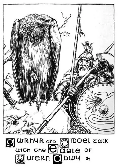 When they came to the eagle, Gwrhyr asked it the same question; but it replied, "I have been here for a great space of time, and when I first came hither there was a rock here, from the top of which I pecked at the stars every evening, and now it is not so much as a span high. From that day to this I have been here, and I have never heard of the man for whom you inquire, except once when I went in search of food as far as Llyn Llyw. And when I came there, I struck my talons into a salmon, thinking he would serve me as food for a long time. But he drew me into the deep, and I was scarcely able to escape from him. After that I went with my whole kindred to attack him and to try to destroy him, but he sent messengers and made peace with me, and came and besought me to take fifty fish-spears out of his back. Unless he know something of him whom you seek, I cannot tell you who may. However, I will guide you to the place where he is."