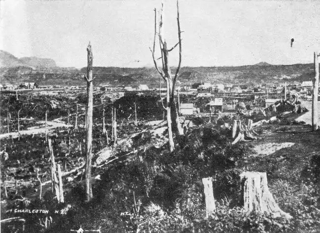 CHARLESTON was born in August of 1866; born, it is said, of two or more venturesome fortune-seekers, Timothy Linahan and another or others, who, having failed to find golden foot-spaces unowned around the river-port of Hokitika, or at the Grey, pushed northward to hunt for others amidst the untrodden spaces and beaches of the coast.