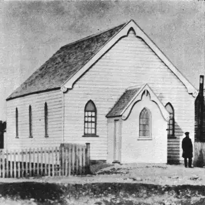 This church stood upon Section 349 in Camp Street South or, as it was then called, Brighton Road. It was built in August, 1867, at the instance of the Rev. Joseph White but was, contrary to his wish, established on the “union basis,” for the use of all Protestant denominations, and termed The Evangelical Union Church.