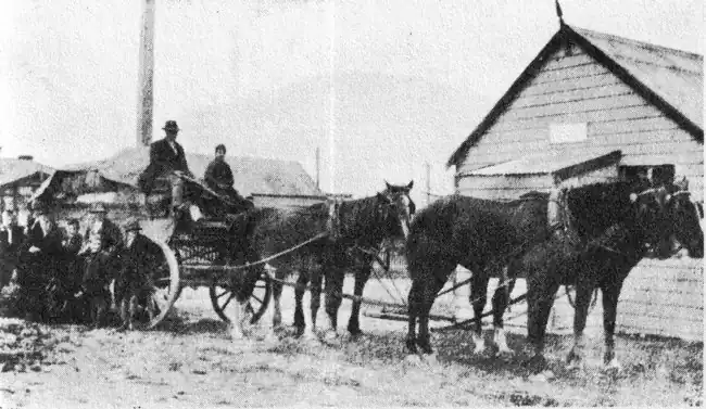 The engine, which cost £200, was a manual affair operated by a see-saw framework with handles at both sides, and capable of throwing a stream of 200 gallons per minute to a height of 120 feet. It was housed in an open-faced building at the northern end of the Camp Reserve, and beside it was the fire-alarm bell. In later days, when no longer required for fire fighting, it was sold to Mr. J. P. Mitchell, who converted the frame and body into an express-wagon. In addition to the fire-engine, fire-buckets were provided and hung in convenient positions about the town. As there was no town water supply, all premises depending upon rain water, the engine could use only such as was obtainable from water-races and dams, of both of which there were several within the town boundary.