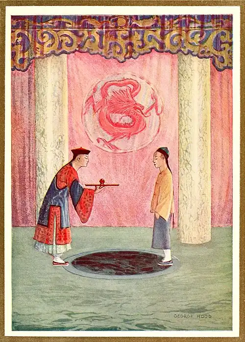 The warrior made a gesture in the direction of the water, and the waves turned into a solid street along which he led Liu I. The dragon-castle rose before them with its thousand gates, and magic flowers and rare grasses bloomed in luxurious profusion. The warrior bade him wait at the side of a great hall.