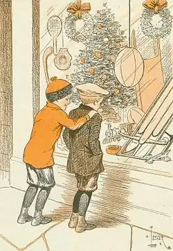 "Here we are," he cried a few minutes later and both boys stopped in front of a small shop window that looked very gay with a wonderful display of Christmas toys.