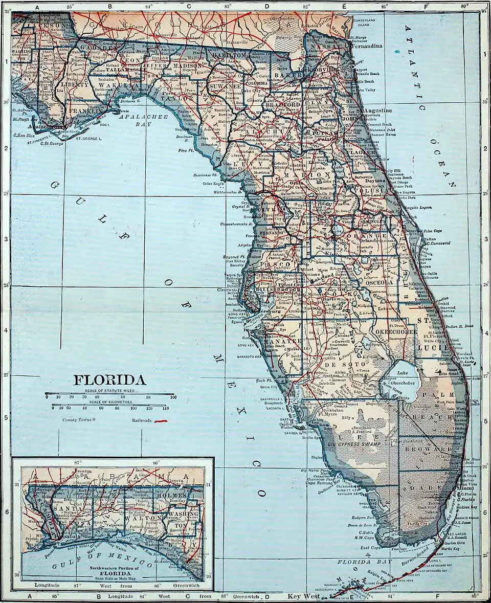 Topography.—The surface of the State is very low and flat, gradually rising from a few feet above sea-level along the coast to a central ridge with an altitude of about 300 feet. The flat lands extending along the coasts consist of open grass-grown savannahs, cypress swamps, pine forests, and “cabbage hammocks,” so called from the extensive growth of the cabbage palms. The W. part of the State, excepting on the coast, is quite hilly. The S. part of the peninsula is built up of successive coral dikes; the upper part being occupied by Lake Okechobee, whose shallow waters gradually merge into the Everglades, an extensive swamp covering the entire lower part of the State. The Everglades are penetrated in all directions by a net- work of small, shallow streams, and at short intervals over the entire area are found wooded islands covered with semi-tropical vegetation. These islands are supposed to have been formerly surrounded by the ocean and to have borne the same relation to the mainland as do the reefs and keys of to-day. The Everglades are separated from the Gulf by extensive cypress swamps, the forests extending down the W. coast, narrowing out around the cape, and extending up along the Atlantic coast. Many of the Florida swamps are so densely overgrown with vegetation that they have been explored but little and are considered impassable. Among these are the Great Cypress in the S. part, and the Fen Holloway and Wakulla swamps farther N. The Okefenoke swamp in the extreme N. extends over into the State of Georgia. Almost the entire Atlantic coast is protected from the ocean by sand bars and coral reefs. Florida is noted for the number, size, and clearness of her springs, the most famous being the Silver Spring near Ocala in Marion county, with an estimated output of 300,000,000 gallons daily. Other notable springs are the Wakulla, near Tallahassee, the Wekiva in Orange county, and the Blue in Marion county. There are numerous sulphuretted springs along the coast; one near St. Augustine, 2 miles out at sea, boils so violently that the waves break against it as though it were a sunken reef. There are numberless lakes, many being aggregations of smaller springs. The largest are Okechobee, Munroe, George, Kissimmee, Crescent, Dexter, Apopka, Harris, and Eustis. These lakes are usually quite shallow and are in many cases connected with the sea by subterranean passages, often causing strange fluctuations, rising and falling at irregular periods.
