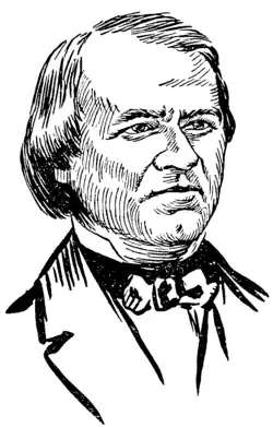 JOHNSON, ANDREW, an American statesman, 17th president of the United States; born in Raleigh, N. C., Dec. 29, 1808. At 10 years of age he was indentured to a tailor, for whom he worked for seven years, receiving no schooling, but was taught to read by a fellow-apprentice. In 1826, with his mother, he emigrated to Tennessee. Here he married Eliza McCardle, a woman of good education, who instructed him in writing and other accomplishments. He was three times elected alderman, and then mayor in 1828–1830. In 1835 and in 1839 he was sent to the Tennessee Legislature. In 1840 he made campaign speeches for Van Buren, that gave him a wide reputation for oratory. In 1843 he was elected to Congress, and re-elected in 1845, 1847, 1849, and 1851. In 1853 Tennessee was “gerrymandered” to prevent his election, whereupon he ran for governor, and was elected. In 1857 he was sent to the United States Senate, where he ably advocated and secured the passage of a homestead bill, which President Buchanan vetoed. He ardently advocated the Union cause, and was made military governor of Tennessee by Lincoln in 1862, where he gave vigorous support to the Federal government. In 1864 was elected Vice-President, with Lincoln, and on the assassination of Lincoln, in April, 1865, became President by succession. His administration was marked by constant dissension between himself and Congress, and he was impeached before that body, for resisting the execution of the acts of Congress, and various alleged “high crimes and misdemeanors.” The trial was presided over by Chief Justice Salmon P. Chase. A two-thirds vote necessary to convict could not be secured, and the trial failed (May 16, 1868). A change of one vote, however, would have carried conviction. When his term expired he retired to Tennessee, and in 1875 was elected to the United States Senate, but died July 31, of that year.