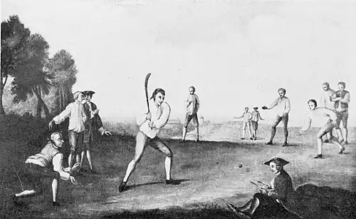 About 1750 "length" bowling was introduced, superseding the all-along-the-ground business, and nearly concurrently the bats straightened instead of curved. And I think we can scarcely say "cricket" began before that, whatever "club-ball" or "stoolball" may have done.