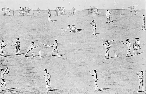 It is not to be supposed that even we, for all our legislation, have witnessed the final evolution of cricket. Legislate we never so often, something will always remain to be bettered—the width of the wicket or the law of the follow on. About the earliest records that have come down to us there is a notable incompleteness that we must certainly regret. The bowler gets no credit for wickets caught or stumped off his bowling. What would become of the analysis of the underhand bowler of to-day if wickets caught and stumped were not credited to him? But at the date of these early records all the bowling was of necessity underhand. Judge then of the degree in which those poor bowlers have been defrauded of their just rights. Whether or no the name of our great national game was derived from the "cricket" in the sense of the crooked stick used for defence of the wicket, it is certain, from the evidence of old pictures, if from nothing else, that crooked sticks, like the modern hockey sticks, filled, as best they might, the function of the bat. They are figured as long and narrow, with a curving lower end. There was no question in those days of the bat passing the four-inch gauge. They must have been very inferior, as weapons of defence for the wicket, to our modern bats—broomsticks rather than bats—more than excusing, when taken in connection with the rough ground, the smallness of the scores, even though the bowling was all underhand and, practically, there was no defence. The solution of these problems, however, is, I fear, buried in the mists of antiquity, and one scarcely dares even to hope for a solution of them, or the fixing of the date of the changes. There are other problems that do not seem as if they ought to be so hopelessly beyond our ken. In Nyren's cricketer's guide, one of the laws of cricket, therein quoted, provides that the wickets shall be pitched by the umpires, yet in part of his time, if not all of it—and when the change was made I cannot find out—it must have been the custom for the bowler to choose the pitch, for he records special praise of the chief bowler of the old Hambledon Club, that on choosing a wicket he would be guided not only by the kind of ground that would help him individually best, but also would take pains to see that the bowler from the other end had a nice bumping knob to pitch the ball on—for by this time "length" bowling, as it was called, had come into general use. Nyren's words are that he "has with pleasure noticed the pains he—Harris—has taken in choosing the ground for his fellow-bowler as well as himself."