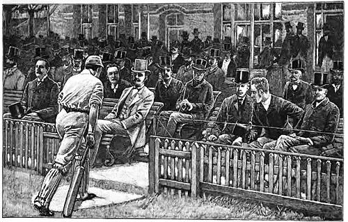 The British public were surprised at these results, especially as it had expected so little from the visitors. Many of the lower classes were so ignorant of Australia itself, to say nothing of the cricket capabilities of its inhabitants, that they fully expected to find the members of Gregory's team black as the Aborigines. We remember the late Rev. Arthur Ward 'putting his foot into it' on this subject before some of the Australians. One day in the pavilion at Lord's, the writer, who had been chosen to represent the Gentlemen of England against the visitors in a forthcoming match, was sitting beside Spofforth watching a game, in which neither was taking part. Mr. Ward coming up, accosted the writer, 'Well, Mr. Steel, so I hear you are going to play against the niggers on Monday?' His face was a picture when Spofforth was introduced to him as the 'demon nigger bowler.' Gregory's team, in the writer's opinion, contained four really good bowlers: Spofforth, Boyle, Allan, and Garrett, and two fair changes in Midwinter and Horan, but as batsmen they were poor when compared with England's best.