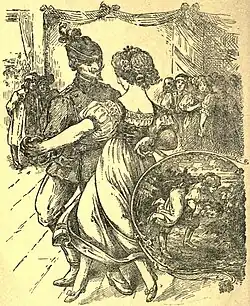 The clock struck eleven and a youth clothed in green entered the room. He went straight up to our Kitty and began to dance with her. All the girls couldn't keep from laughing, but they daren't laugh openly. So they held their aprons over their faces. Kitty was very angry, but she kept on dancing like the wind. She thought: "Let the fools laugh; they'd be glad enough to dance with the lad themselves."