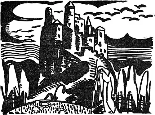 The castle was built entirely of lead. The twelve ravens circled above it and in front of it stood an old woman leaning on a long leaden staff. She was a Yezibaba. Now you must know that a Yezibaba is an ugly old witch with a hooked nose, a bristly face, and long scrawny hands. She’s a bad old thing usually, but sometimes, if you take her fancy, she’s kind.