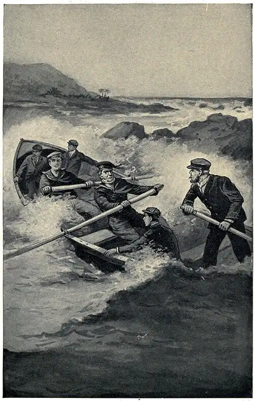 Soon the small boat was ready to go ashore. Billy Dill and the other sailor, Smiley, were at the oars, while Captain Sanders was in the stern, to steer and give directions.