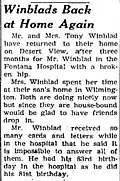 Mr. and Mrs. Tony Winblad have returned to their home on Desert View, after three months for Mr. Winblad in Fontana Hospital with a broken hip. Mrs. Winblad spent her time at their son's home in Wilmington. Both are doing nicely but since they are house-bound would be glad to have friends drop in. Mr. Winblad received so many cards and letters while in the hospital that he said is impossible to answer all of them. He had his 83rd birthday in the hospital as he did his 81st birthday.