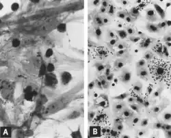 Replication of PPV in vitro is cytocidal and characterized by "rounding up," pyknosis, and lysis of cells (Fig. 17.1A). Many of the cell fragments often remain attached, eventually giving the affected culture a ragged appearance. Intranuclear inclusions develop (Cartwright et al. 1969) but they are often sparsely distributed (Rondhuis and Straver 1972). Infected cultures may hemadsorb slightly (Cartwright et al. 1969) (Fig. 17.1B). Cytopathic changes are extensive when cell culture-adapted virus is propagated under appropriate conditions. However, on initial isolation several serial passages of the virus (Cartwright et al. 1969) or, better, the infected culture may be necessary before the effects are recognized. The use of immunofluorescence (IF) microscopy greatly increases the likelihood of detecting minimally infected cultures (Lucas and Napthine 1971; Mengeling 1975).