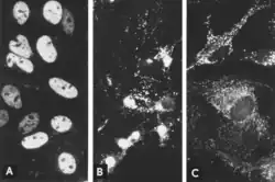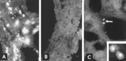 Several investigators have used IF microscopy to follow the development of PPV in cell culture (Cartwright et al. 1969; Lucas and Napthine 1971; Mengeling 1972; Siegl et al. 1972; Bachmann and Danner 1976). In general, the sequence of events is as follows. Viral antigen is detected in the cytoplasm of cells soon after infection if the inoculum contains a high titer of virus and viral antigen. Most, if not all, of this early cytoplasmic fluorescence is the result of antigen phagocytized from the inoculum (Mengeling 1972; Mengeling and Cutlip 1975). By sequential examinations, such antigen can be demonstrated first on the external surface of the cytoplasmic membrane and later within the cytoplasm, often relatively concentrated in a juxtanuclear location. The first unequivocal evidence of viral replication is the appearance of nascent viral antigen in the nucleus (Fig. 17.2A). In at least some infected cells, nascent antigen next appears in the cytoplasm in sufficient quantity that both cytoplasm and nucleus are brightly fluorescent. Infected cells commonly seen in the lung of fetuses that develop a high titer of antibody for PPV probably represent this stage of replication (see Fig. 17.8C). Affected cells subsequently round up, become pyknotic, and disintegrate with release of virus and viral antigen (Fig. 17.2B). Other cells in the culture that are not at the appropriate stage to support viral replication continue to phagocytize and accumulate viral antigen in their cytoplasm (Fig. 17.2C). A second wave of viral replication can be induced if these cells are stimulated to enter the S phase of the cell cycle as, for example, by the addition of fresh culture medium.