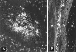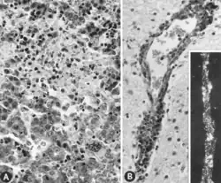 In contrast, macroscopic changes have not been reported for fetuses infected after they become immunocompetent for PPV. Microscopic lesions are primarily endothelial hypertrophy (Hogg et al. 1977) and mononuclear cell infiltrations consistent with an immune response (Hogg et al. 1977; Joo et al. 1977). Meningoencephalitis characterized by perivascular cuffing with proliferating adventitial cells, histiocytes, and a few plasma cells was seen in the gray and white matter of the cerebrum and in the leptomeninges of PPV-infected stillborn pigs. These lesions were believed to be pathognomonic for PPV infection (Narita et al. 1975). Similar lesions have been observed in PPV-infected, live fetuses collected late in gestation (Hogg et al. 1977; Joo et al. 1977) (Fig. 17.7B).
