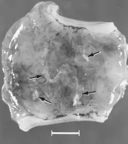 Macroscopic lesions have not been reported in pregnant dams; however, microscopic lesions have been seen in tissues of gilts killed after their fetuses were infected by transuterine inoculation of virus. Gilts that were seronegative when their fetuses were infected at 70 days of gestation had focal accumulations of mononuclear cells adjacent to the endometrium and in deeper layers of the lamina propria when they were killed 12 and 21 days later. In addition, there were perivascular cuffs of plasma cells and lymphocytes in the brain, spinal cord, and choroid of the eye (Hogg et al. 1977). When fetuses were infected earlier in gestation (35, 50, and 60 days) and their dams were killed 7 and 11 days later, the lesions were similar. However, uterine lesions were more severe and also included extensive cuffing of myometrial and endometrial vessels with mononuclear cells (Lenghaus et al. 1978). Only focal accumulations of lymphocytes were seen in uteruses of gilts that were seropositive when their fetuses were infected (Cutlip and Mengeling 1975b).