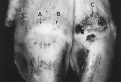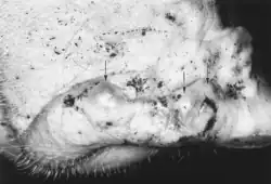 A vesicular lesion begins as a small blanched area and progresses to a blanched, slightly raised area that expands as vesiculation progresses. The epithelium may separate from the stratum basale, leaving a red lesion with shreds of torn epithelium. Vesicular fluid may leak through the stratum corneum without the formation of a true vesicle (Seibold and Sharp 1960). Since vesicles are most often seen at the site of mechanical stress, they usually rupture quickly, leaving a red erosion. Often, lesions are contaminated with dirt and debris (Fig. 25.2), resulting in infection with opportunistic bacteria. The foot lesions, especially of VES, may be associated with a cellulitis with persistent swelling, resulting in lameness and local lymph node involvement. In young animals infected with FMDV, myocardial necrosis may produce pale necrotic areas referred to as "tiger heart."