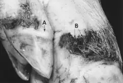Vesicles yield a serous fluid if they rupture (usually 6–24 hours after formation), and the epithelial layers above the stratum germinativum may detach. Eroded, hyperemic, hemorrhagic lesions are present. The hoof may become detached if the vesicles have coalesced around the coronary band. Severe laminitis may be followed by a chronically deformed foot. After the initial stage of infection, the animal’s temperature may drop to 40˚C. The lesions heal within 7–14 days if no secondary bacterial infection occurs.
