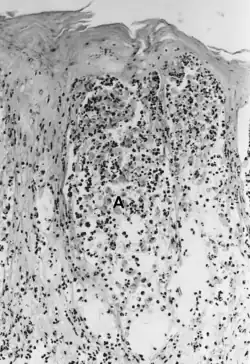 The histopathology of FMD, SVD, and VES is considered quite similar. The lesions begin in the stratum spinosum, where vesicles form because of hydropic degeneration and intercellular edema. Keratinocytes die, become spherical, and float as single or clustered cells in the vesicular fluid (spongiosa) (Fig. 25.5A). The stratum basale essentially remains intact but may be somewhat disrupted by VESV infection (Mebus 1977).