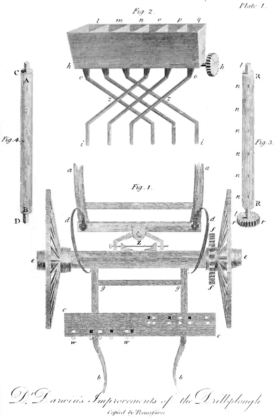 Lastly, Dr. Darwin concludes with remarking, that the facility of adapting the holes to the dimensions required in both machines, and the circumstance, that they neither bruise nor break the grain, and are not encumbered with an additional hopper, which must deliver the quantity of seed with great inaccuracy, from the unequal shaking of the machine, considerably add to the excellence and simplicity of both.