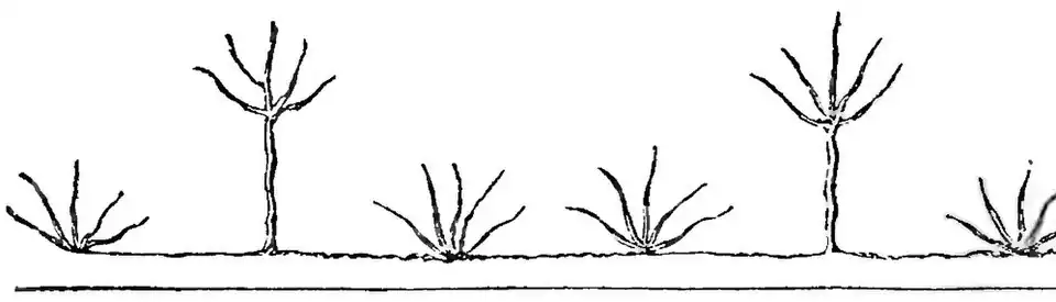 But, though the soil and space for standards, according to our plan, be rather sparingly alotted, yet there would remain a considerable piece of ground between them unemployed, for 15 or 20 years, while they are young and growing: hence it will be advisable to plant and train between every two standards in the horizontal rows, a small or dwarf tree, with a limited top or crown; bearing early and abundant fruit, till the stems have attained so large a size, and such spreading branches, as to overshadow and stifle their useful, but diminutive neighbours. Thus, the latter must, according to circumstances, yield the room they occupy, to the former; and, after having amply repaid the trouble of rearing them, and their proportion of ground-rent, they may still, with proper exertion, be transplanted to another situation.