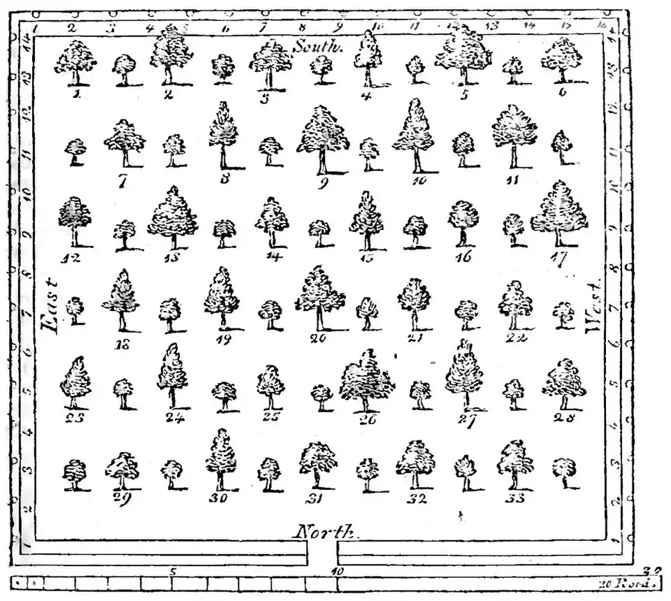 Having given this general outline relative to the planting of orchards, we should consider our work deficient on a subject of such importance, if we neglected the opportunity of communicating a more complete and systematic introduction to horticulture, with which we have been favoured by Mr. Christ, an eminent and practical German writer. In order to enhance the value of this essay, we have procured the subjoined Cut, which represents a design for an orchard occupying two acres of ground (Rhenish measure), that is, 19 roods in length, according to the horizontal rows; and 17 roods in breadth, conformably to the perpendicular lines.
