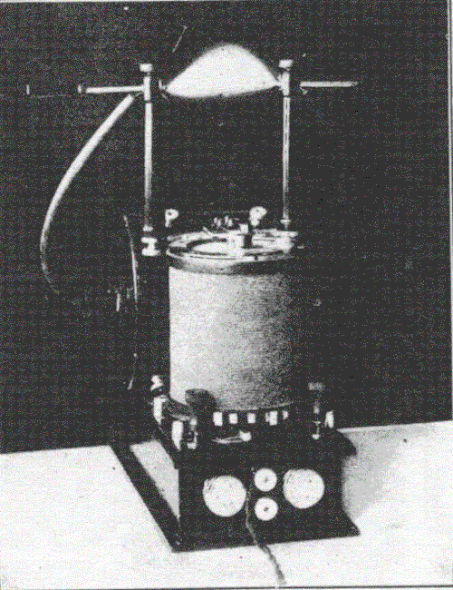 Fig. 6. Unique Alternating Current Generator for Exciting Tesla's Early “Beat” Receptor. Actuated by Comprest Air or Steam Which Vibrates a Special Diafram-Coil.