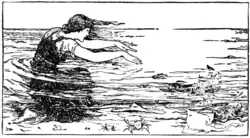 The giant's daughter went out next morning with the lad's breakfast, and found him in a terrible state, for always as he cleaned out a bit, it just fell in again. The giant's daughter said she would help him, and she cried all the beasts in the field, and all the fowls in the air, and in a minute they all came, and carried away everything that was in the stable and made it all clean before the giant came home. He said: "Shame on the wit that helped you; but I have a worse job for you to-morrow." Then he said to Nix Nought Nothing: "There is a lake seven miles long, and seven miles deep, and seven miles broad, and you must drain it to-morrow by nightfall, or else I'll have you for my supper." Nix Nought Nothing began early next morning and tried to lave the water with his pail but the lake was never getting any less, and he didn't know what to do; but the giant's daughter called on all the fish in the sea to come and drink the water, and very soon they drank it dry. When the giant saw the work done he was in a rage, and said: "I've a worse job for you to-morrow; there is a tree, seven miles high, and no branch on it, till you get to the top, and there is a nest with seven eggs in it, and you must bring down all the eggs without breaking