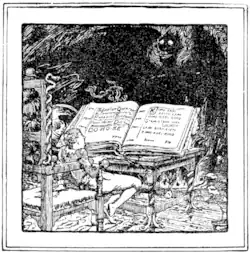 One day the master was out, and then the lad, as curious as could be, hurried to the chamber where his master kept his wondrous apparatus for changing copper into gold, and lead into silver, and where was his mirror in which he could see all that was passing in the world, and where was the shell which when held to the ear whispered all the words that were being spoken by any one the master desired to know about. The lad tried in vain with the crucibles to turn copper and lead into gold and silver—he looked long and vainly into the mirror; smoke and clouds passed over it, but he saw nothing plain, and the shell to his ear produced only indistinct murmurings, like the breaking of distant seas on an unknown shore. "I can do nothing," he said, "as I don't know the right words to utter, and they are locked up in yon book." He looked round, and, see! the book was unfastened; the master had forgotten to lock it before he went out. The boy rushed to it and unclosed the volume. It was written with red and black ink, and much of it he could not understand; but he put his finger on a line and spelled it through.