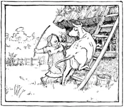 Well, he set out, and he travelled a long way, and at last he came to a woman's cottage that had some grass growing on the roof. And the woman was trying to get her cow to go up a ladder to the grass, and the poor thing durst not go. So the gentleman asked the woman what she was doing. "Why, lookye," she said, "look at all that beautiful grass. I'm going to get the cow on to the roof to eat it. She'll be quite safe, for I shall tie a string round her neck, and pass it down the chimney, and tie it to my wrist as I go about the house, so she can't fall off without my knowing it." "Oh, you poor silly!" said the gentleman, "you should cut the grass and throw it down to the cow!" But the woman thought it was easier to get the cow up the ladder than to get the grass down, so she pushed her and coaxed her and got her up, and tied a string round her neck, and