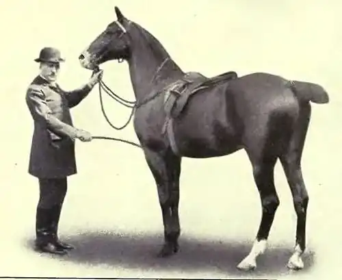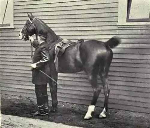 The horse, saddled and bridled, is led to the spot selected for the first lesson. The stirrups are raised on the saddle, and the snaffle reins are passed forward over the head, and held in the left hand of the trainer, who stands in front facing the animal, the whip in his right hand. The man speaks soothingly, exhibits the whip, and with it caresses the horse's forehead, nostrils, ears, and both sides of the neck. (Figure 1.)
