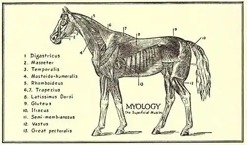 Two other especially powerful muscles of the neck are concerned primarily with locomotion. The rhomboideus is connected at the atlas region with the other muscles of the head and neck; but when this atlas region is fixed, it draws the shoulder forward and upward. It is, therefore, related to the scapulo-angularis and latissimus dorsi of the chest. The other large muscle, the mastoido-humeralis, has also one of its ends at the atlas region, and the other at the shoulder and chest. When the atlas region is fixed, at the same time that the rhomboideus lifts the fore leg, the mastoido-humeralis carries it forward. But if the chest region is the fixed point, this muscle draws the head and neck to one side. It is by means of the flexions that we obtain for these two muscles the fixed point in the atlas region. When the horse accepts contact of the bits on the bars, the rider controls directly the muscles of the head, and indirectly those of the neck. Thus by the continual communication of this indirect effect, which in its turn, emanates from the first direct effect of the bits on the bars, the rider controls also the action of the front limbs.