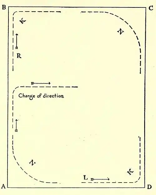 At the gallop, the difficulties are multiplied by the three changes of lead. The rider being at the right hand before the movement, executes the half-passage leading to the right to A or B, at which point the lead has to be changed from right to left to execute the half-passage from B to C. Arrived at C, the lead is to the left and has to be changed to the right at C. Finally, the horse, now returned to the right-hand lead, has to turn the corner at this new hand, which is the same as that before the execution of the figure.