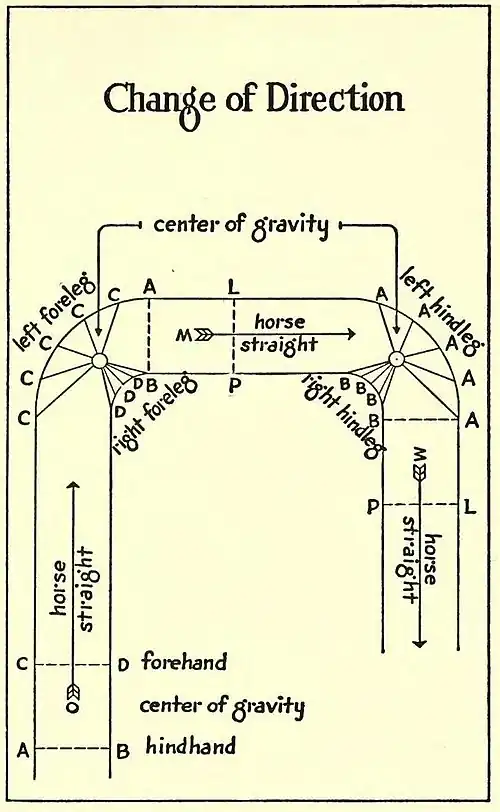 But for the impulsion of the hind quarters, both the rider's legs are necessary. The left prevents the haunches from yielding to the effect of the right, and thus departing from the proper path ACL. The right leg of the rider pushes forward the right hind leg of the horse, and since this is prevented from moving toward the left off the line BDP, the center of gravity must remain on the line OM; and momentum, velocity, and equilibrium remain altered.
