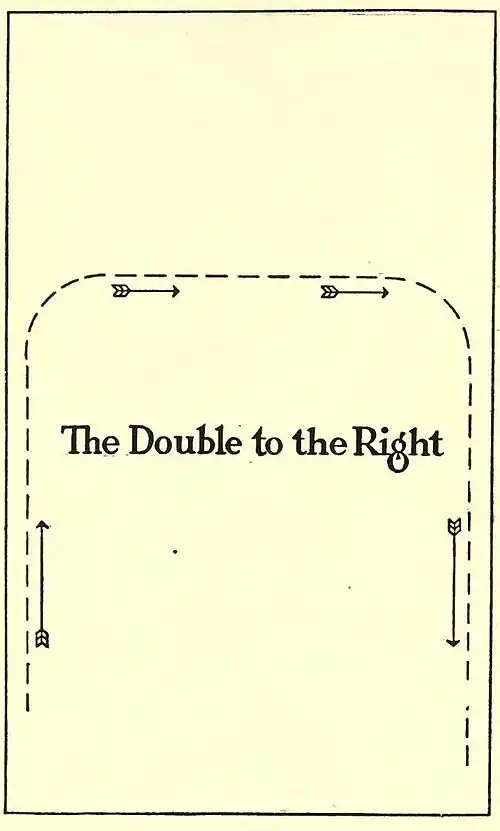 The movement is simple, and easy of execution for the experienced rider with a horse that is sufficiently advanced with its education. The essential point is to manage correctly the first change of direction, and then to guide the horse exactly straight across to the other side of the manege for the second change which completes the double. At first view, it looks very easy to do this; but in practice it is not so simple, and the maneuver is asked of the horse precisely in order to accustom it to change and return straight. The rider also will find the double educative if he does it correctly. The point is to cure any hesitation on the part of the horse in turning to either side, and to get it to place itself exactly straight from head to croup as soon as it has turned. The rider who can do the double correctly at walk, trot, and gallop is on the road toward the perfect education of his horse.