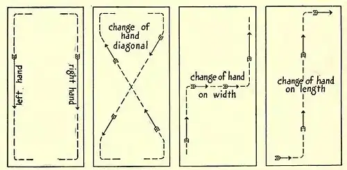 When riding at the right hand, the horseman may change hand by means of a great variety of movements—changes in width, in length, in diagonal, the half-volte, or the reversed half-volte, all of which will be discussed shortly. All changes of hand are, however, really nothing but changes of direction. But since in reversing the side which is toward the center of the ring, there has to be also a reversing of the position of the reins in the hands, changes of direction have come to be called changes of hand.