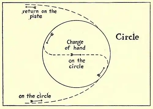 The circle is a figure of manege executed near the center of the ring by a single horseman, or by several horsemen following one another. This figure may also be executed on a road, a piste, or a field.