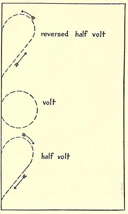 In executing the half-volte, the horse makes two successive changes of direction, so that he faces the opposite way from his original position. Suppose, for example, the horse is traveling along a piste, at right hand, and near the wall. A change of direction at the corner of the manege, followed immediately by another, places the animal about three steps away from the wall and facing toward what was the rear. Thereupon, moving on a diagonal line, the horse returns to the piste.