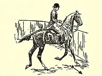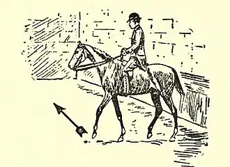 The manege is commonly rectangular, with two long and two short sides and a surrounding wall. The horse travels straight along the sides, but changes direction at the angles, to the right if being ridden with its right side toward the center—"at right hand" as it is called—to the left if the other way. Naturally, the animal tends to follow the barrier, and will, therefore, instinctively and of its own volition, make the turn before getting quite to the corner, or else will put its head against the wall and stop. In either case, the rider loses an opportunity to practice the management of his mount.