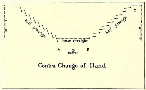 CONTRE-CHANGE of hand is a figure of manege resembling the square. After the horse has passed the short side of the ring and has taken about ten steps on the long side, the rider begins a diagonal change of direction by the half-passage. Arrived at the point, A, ten steps from the center, O, of the manege, the horse is put straight again for twenty steps to B; and after that returns to the long side by a half-passage at C, at the same hand as before the execution of the figure.