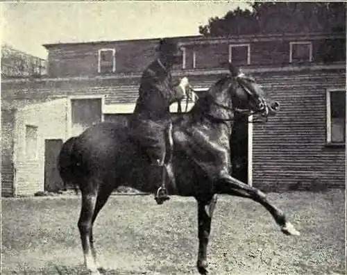 This exercise of the jambettes is, however, highly useful for still another purpose. Since the horse's equilibrium is the sine qua non of the équitation savante, it is very necessary that the rider should be able, at will, to place the fore legs of his mount perpendicular to its body and to the ground. Control of each several limb by means of reins and legs makes it possible for the cavalier to rectify immediately a wrong position of any one. When, therefore, the horse has all its legs perpendicular to the ground and parallel to one another, there exists the state of equilibrium with correct location of the center of gravity. The rider's seat is accurate, so that a transfer of his weight, forward, to the right, to the left, or backward, impels the horse in one of these directions.