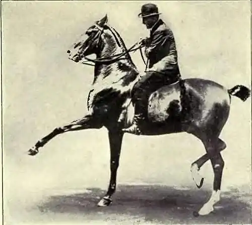 After this work on foot has continued until the horse is thoroughly confirmed in the gait, the trainer mounts, and once more obtains the extension by touching the horse's shoulder with the whip. When this much is done well and easily, standing, the rider by means of his legs, sends the horse forward at a slow walk. He then, with the whip, touches the shoulder next the wall shortly before the leg on that side has begun to lift.