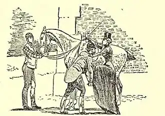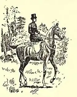 A horsewoman can, however, mount by herself, by lengthening her stirrup, and then, when seated, adjusting it again. She can also mount by aid of a stone, tree, fence, or other elevation. For all these, however, she must be assured of the temper and docility of her horse. I recommend all young riders to learn to mount alone. It is good practice, and often very useful both in hunting-field and on promenade.
